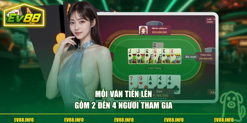 Một bàn đánh bài Tiến Lên tiêu chuẩn có từ 2 đến 4 người tham gia. Mỗi tụ được chia 13 lá ngay từ đầu ván. Với số lượng này, nhịp chơi được giữ ổn định và không quá kéo dài. Thông thường, bàn 4 chiếm hơn 65% lựa chọn vì tạo sự cân bằng chiến thuật, người chơi có nhiều cơ hội quan sát và dự đoán đối thủ.
